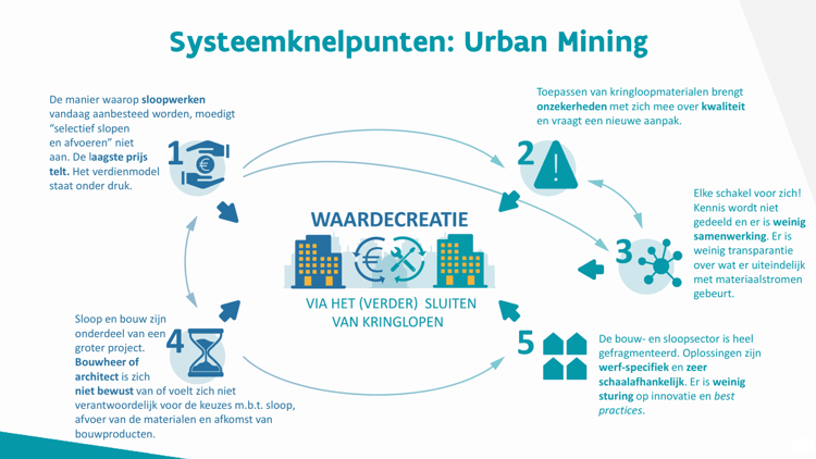De circulaire economie is gericht is op het zo lang mogelijk hergebruiken, repareren, delen, herstellen en recycleren van producten en materialen om afval te minimaliseren en grondstofgebruik te verminderen. In een sloopproject met circulaire ambities wordt getracht zo veel mogelijk van de bestaande gebouwen en materialen opnieuw te gebruiken, zij het door delen van het gebouw te behouden, door materialen te hergebruiken of ze te recycleren. Dit noemen we urban mining. Het uiteindelijke doel is om de milieu-impact van sloopwerken te verkleinen en de waarde van materialen zo veel mogelijk te behouden.